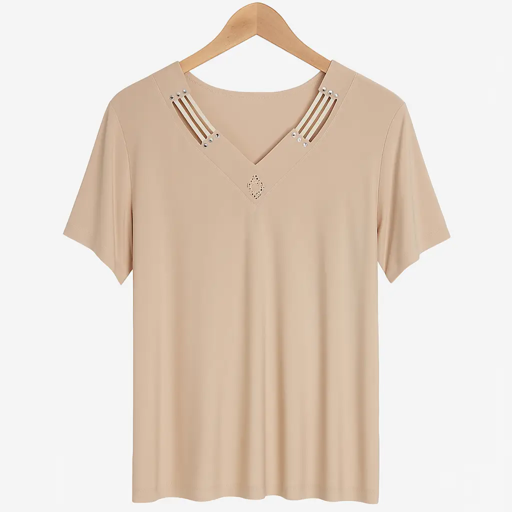 Elevate your everyday look with this chic beige V-neck short sleeve ladies’ top. Crafted from soft, breathable fabric, it features elegant strap detailing at the neckline adorned with subtle metallic accents for a modern twist. Perfect for casual outings, office wear, or evening get-togethers, this versatile piece pairs beautifully with jeans, skirts, or trousers.