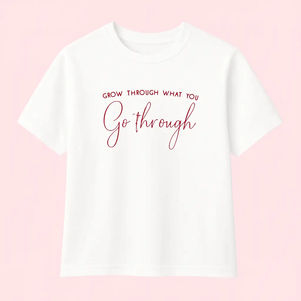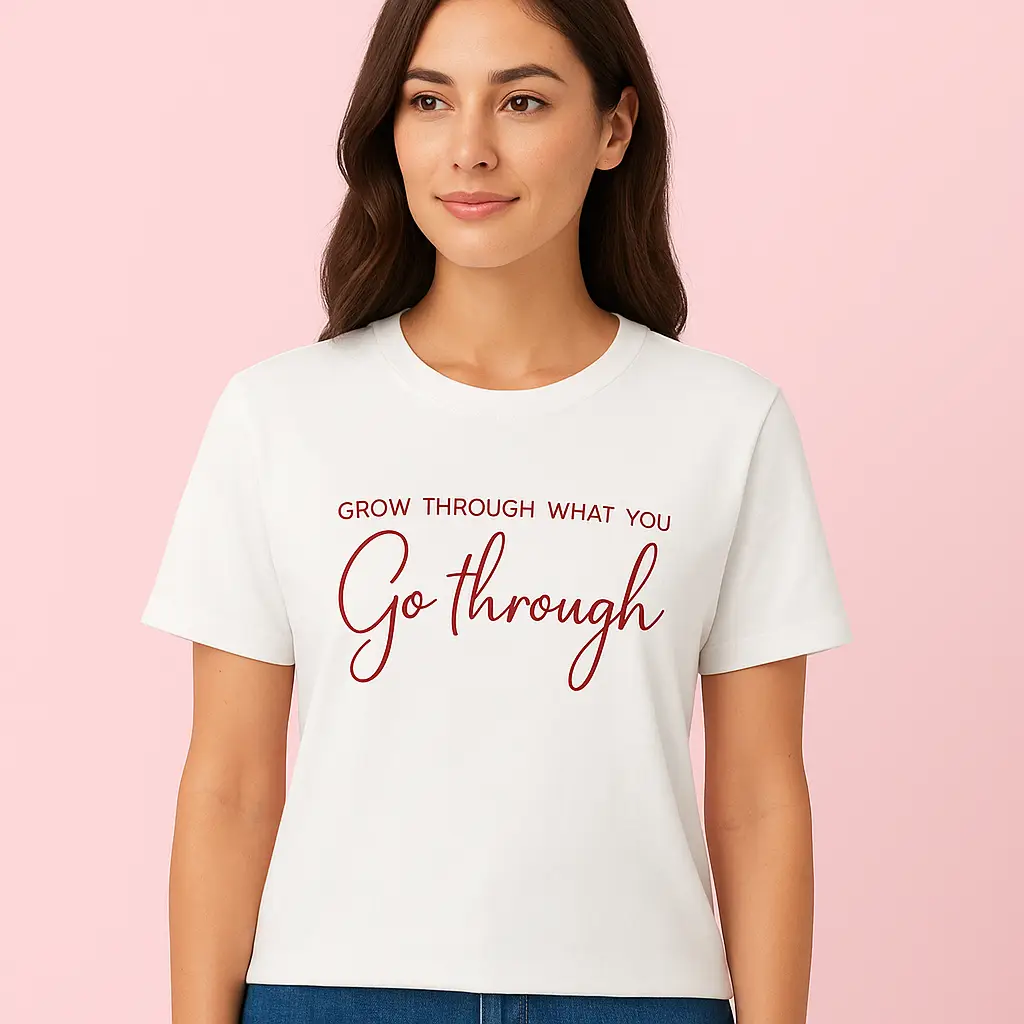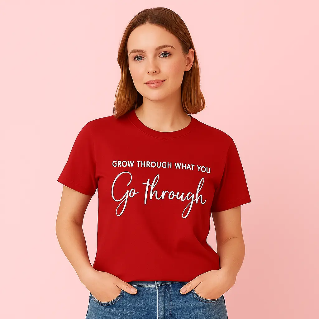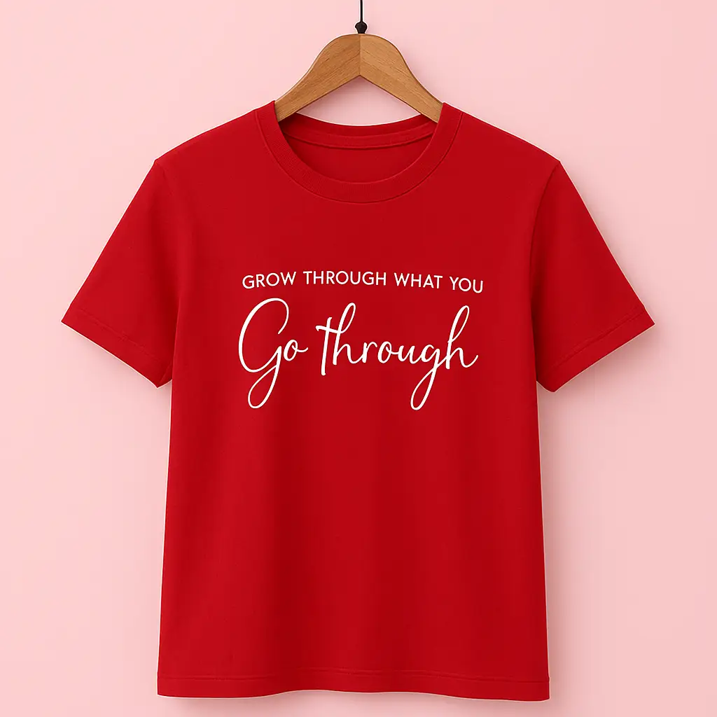 Stay confident and stylish with our Motivational Quote T-Shirt for Women, available in red and white. Featuring the inspiring phrase “Grow Through What You Go Through”, this tee is a perfect blend of comfort and positivity.