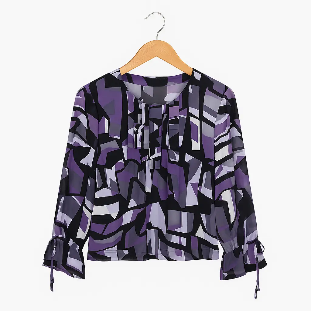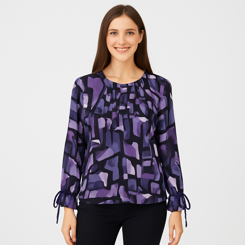 Elevate your everyday style with this chic purple abstract geometric print ladies top. Designed with a lightweight fabric and flowy silhouette, this top offers both comfort and elegance. Featuring a round neckline with pleated details, long sleeves with drawstring cuffs, and a modern loose fit, it’s the perfect choice for casual outings, office wear, or evening get-togethers. Pair it with jeans, trousers, or skirts for a versatile look that stands out.